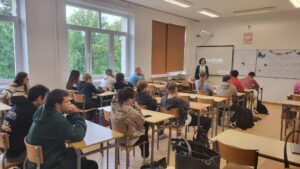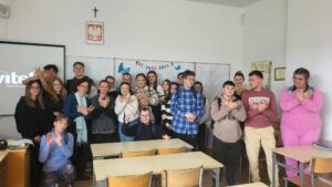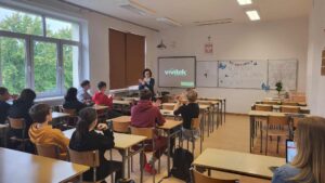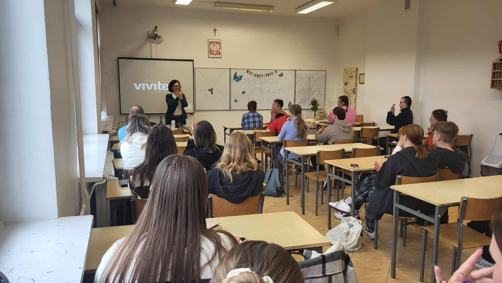 Wyjątkowym punktem spotkania była prezentacja naszej uczennicy Oliwii Maciejczyk z klasy 5 TŻC, która opowiedziała o działaniu implantu ślimakowego – urządzenia wspierającego osoby z wadą słuchu w odbieraniu dźwięków. Dzięki temu uczniowie mogli lepiej zrozumieć, jak trudną drogę musi pokonać osoba niesłysząca, aby „usłyszeć świat”. Na zakończenie młodzież poznała symbol osób niesłyszących – motyla, a także spróbowała pysznych ciasteczek w jego kształcie. Serdecznie dziękujemy: