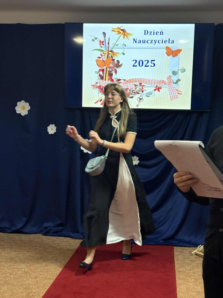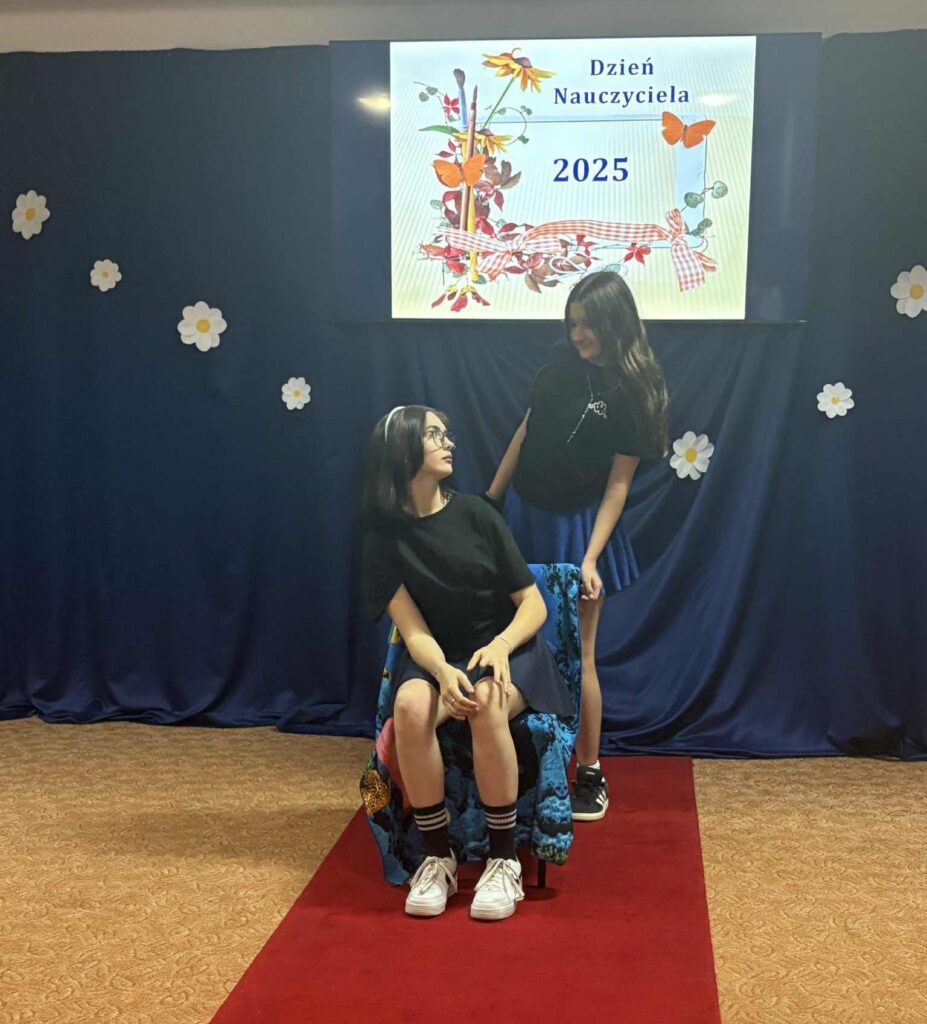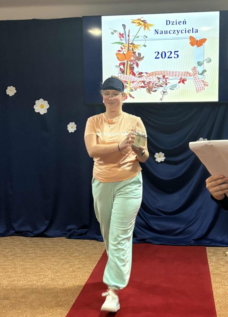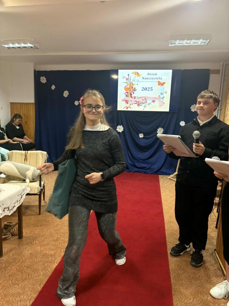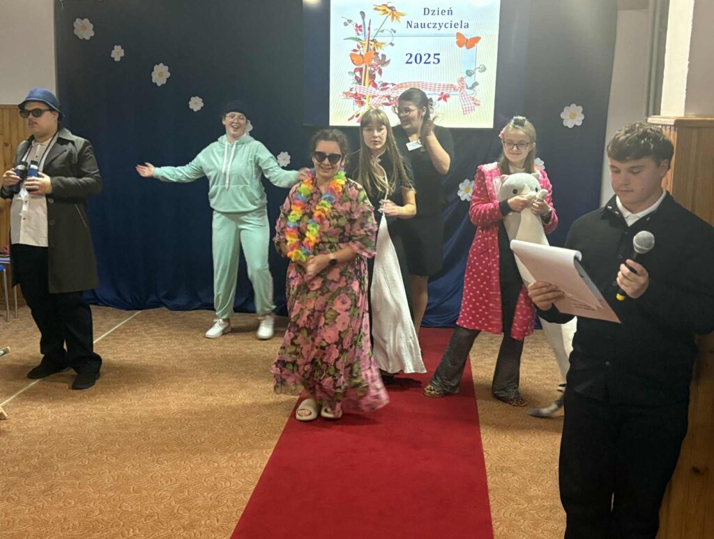 Również w naszym internacie świętowaliśmy Dzień Edukacji Narodowej. Z tej okazji wychowankowie przygotowali niecodzienny pokaz mody, podczas którego zaprezentowane zostały stroje charakterystyczne dla wychowawców w różnych rolach i sytuacjach. Oglądaliśmy tajemniczego Wychowawcę Szpiega, rządzącego Wychowawcę Głównego, czuwającego nad wychowankami nocną porą Wychowawcę Nocnego, był też elegancki Wychowawca na Balu i zrelaksowany Wychowawca w Domu po Pracy, a także gotowy na każdą przygodę Wychowawca na Wakacjach. Gra naszych wspaniałych aktorów, rymowane opisy a do tego odpowiednia muzyka sprawiły, że wszyscy dobrze się bawili. Spotkanie uświetnił też układ taneczny wykonany przez Anię i Karolinę. Na zakończenie młodzież przekazała wychowawcom podziękowania za codzienną pracę, cierpliwość, wsparcie i atmosferę, jaką tworzą, sprawiając, że internat staje się drugim domem.